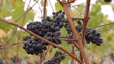 The terrace overlooks a lawn which rolls down to the vineyard.